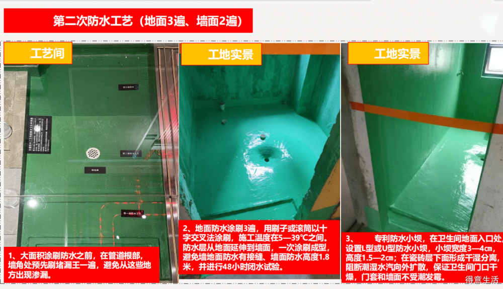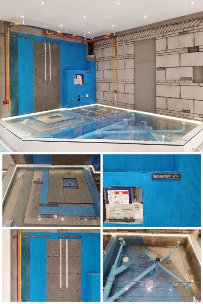 他们家在卫生间是做两次防水,两层防水中间会有暗地漏,可以把从瓷砖缝隙渗下去的水给排走,防止瓷砖和防水层之间存着水汽,让整个卫生间一直到都潮潮的!