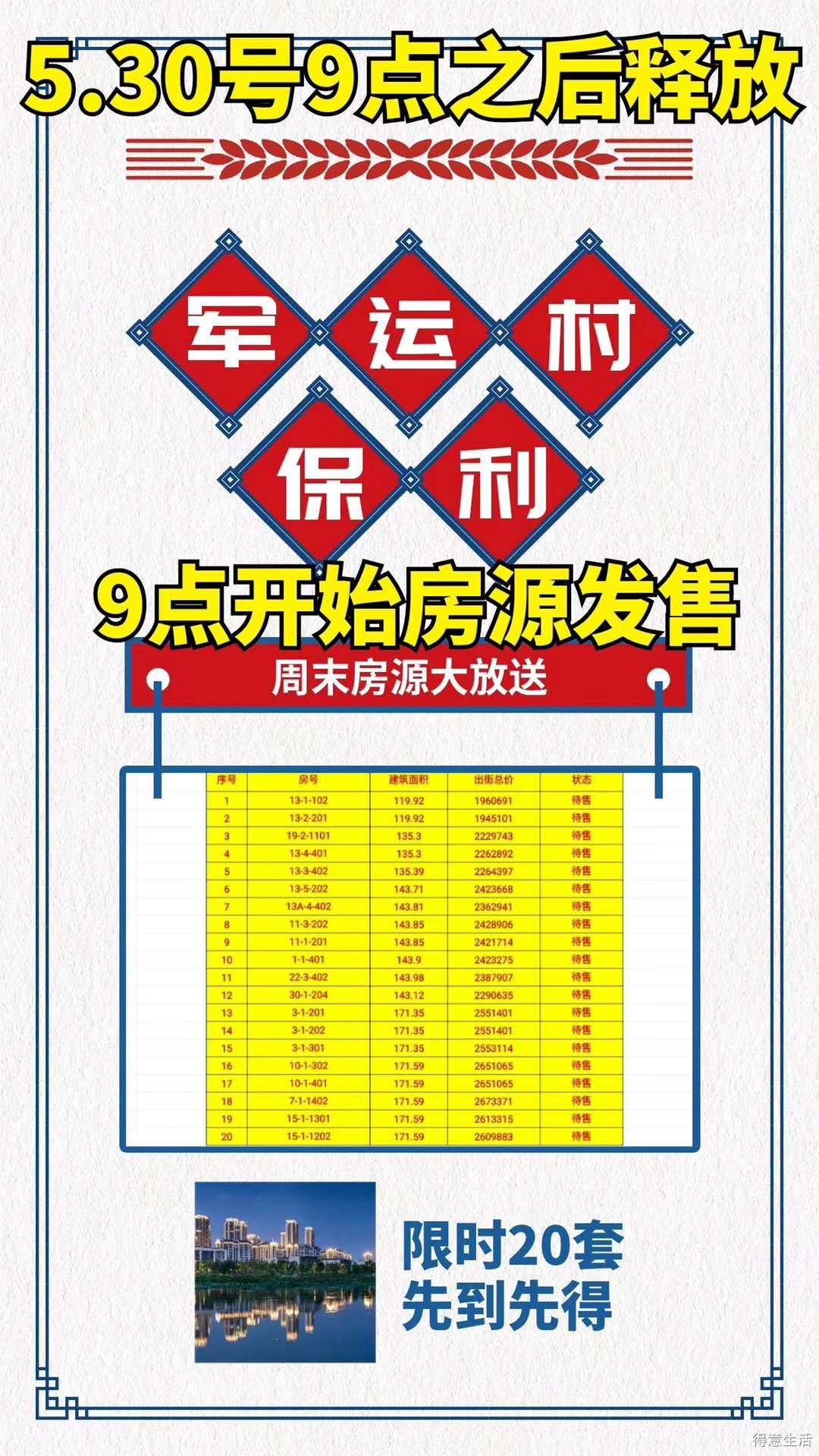 咨询:一三四七六零二零五二七 罗经理(微信同号)+V详询保利军运村 限时20套,先到先得现房,预计2020年9月底交房均价1